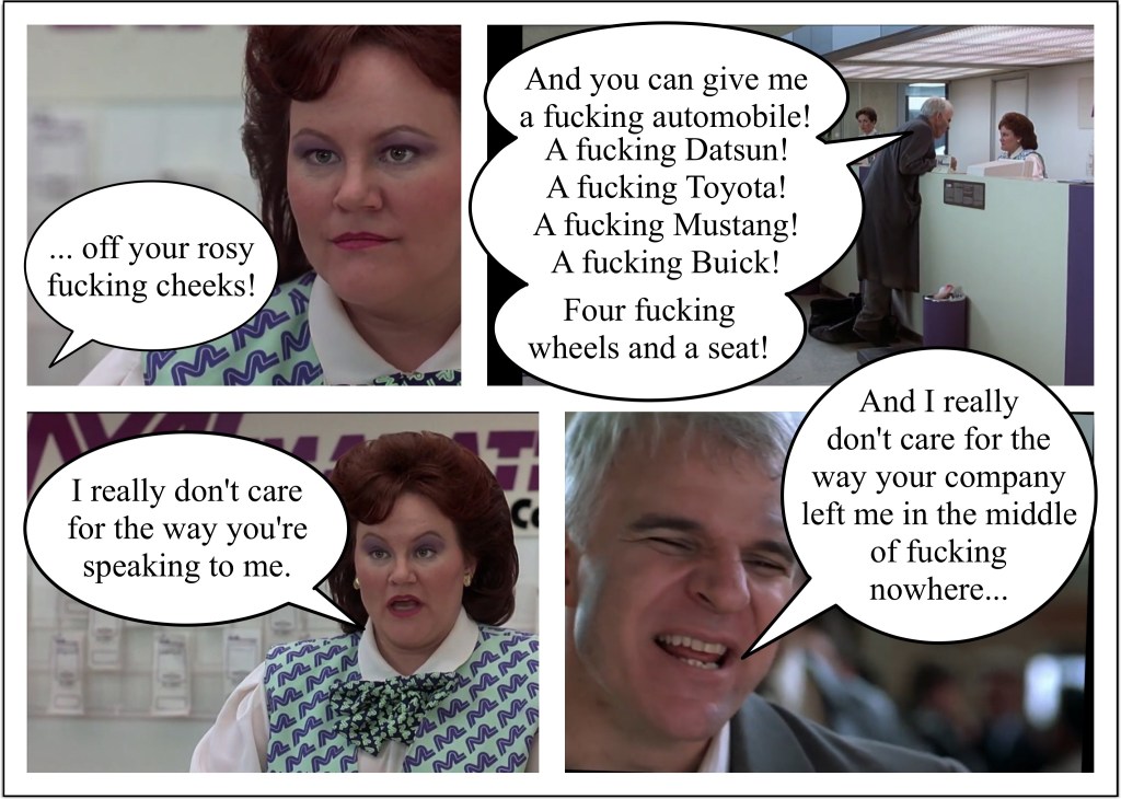 Uptight ad account executive, Neal Page (Martin), is eager to get home to his family in Chicago for Thanksgiving after a business trip in New York. Things don’t go smoothly to say the least, exasperated by several encounters with Del Griffith (Candy), a friendly, but overly enthusiastic/obnoxious shower curtain ring salesman. Their plane gets diverted to Wichita, Kansas due to a heavy snowstorm, from there they do all they can to make it back to Chicago. Given that this is a road trip/buddy film, this means that everything that can go wrong absolutely will!