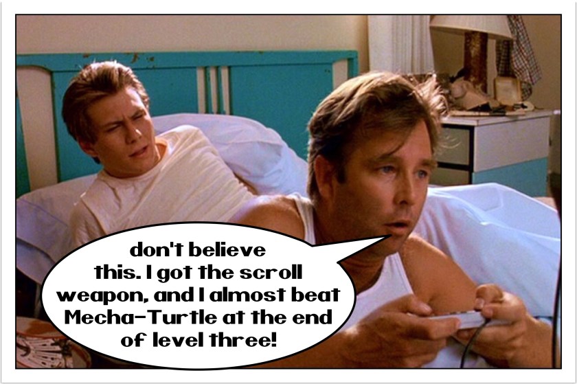 During the motel night stay, Nick attempts to bond with his dad, only to give up and fetch the NES system from their truck (not sure why it’s there. I mean I know for product placement purposes why it’s there! But I’m talking narrative purposes) and starts playing some Teenage Mutant Ninja Turtles! Sam scoffs at his son playing such a silly game, that is until he’s drawn to the power the little black and grey machine possesses on the human soul!