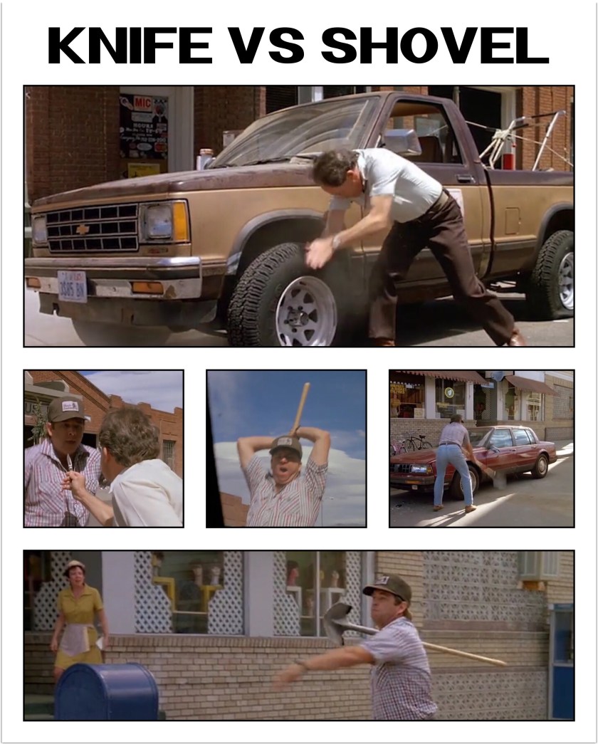 We also follow Sam and Nick who are on Corey and Jimmy’s trail, along with the super rude Putnam! Being rude is basically the main reason to dislike him, that and he looks like a creeper. This slimy little man is not above sabotaging Sam’s ride (a beat up old pickup truck with a tree in the bed, the ultimate dad mobile!), but Sam gleefully fights back with some good old fashioned shovel whacking (even throwing it like a javelin at one point!). Having a couple flat tires means he and Nick need to stay the night while they get new ones.