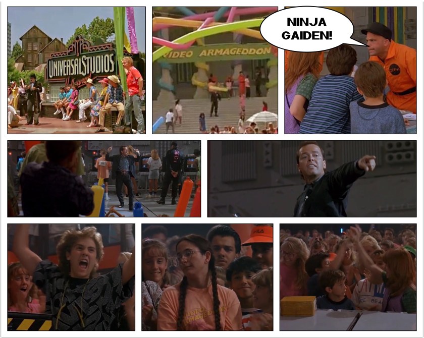 Eventually they make it to Video Armageddon at Universal Studios Hollywood, where the competition is underway (with Lucas there of course!). The guy announcing the competition is a super intense dude (probably high on cocaine! It is 1989!), who doesn’t so much chew the scenery as devour it! Jimmy gets a late start, but is able to gather up enough points to be among the finalists (along with Lucas and a girl named Mora). [It’s actually surprising to see a girl as one of the finalists in a video game competition in a movie from 1989! I’m certainly not complaining, it’s just not something you expect to see!] It’s also announced that a brand new, never before game will be what the finalists are playing.