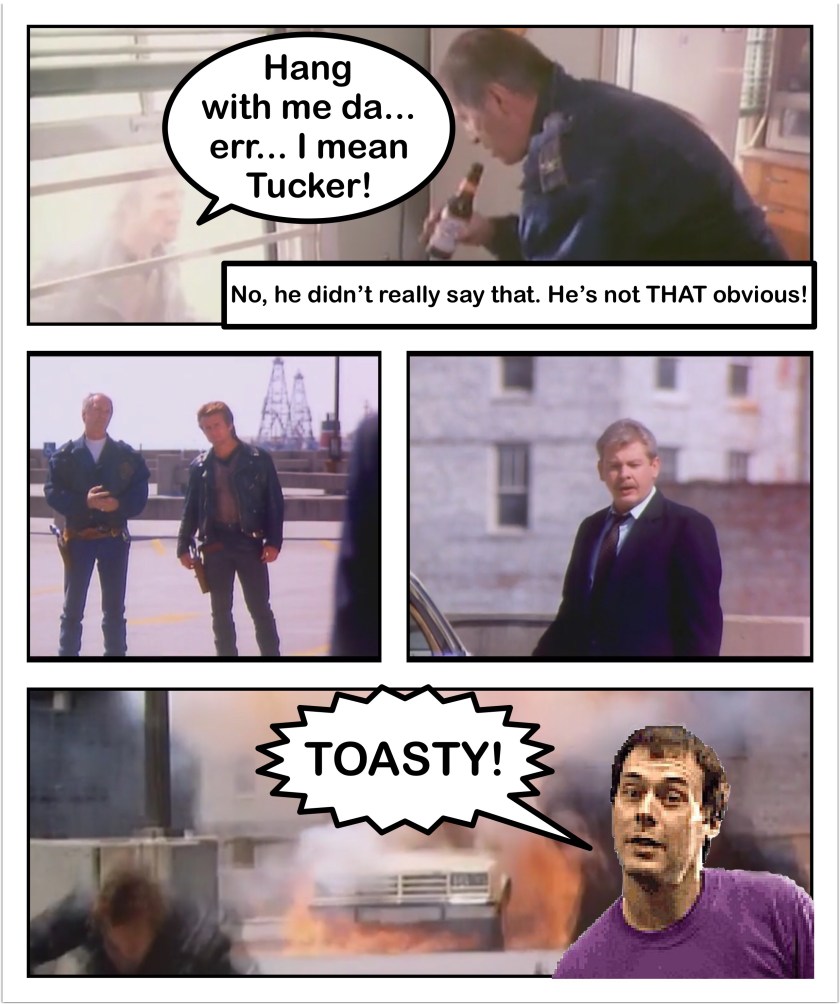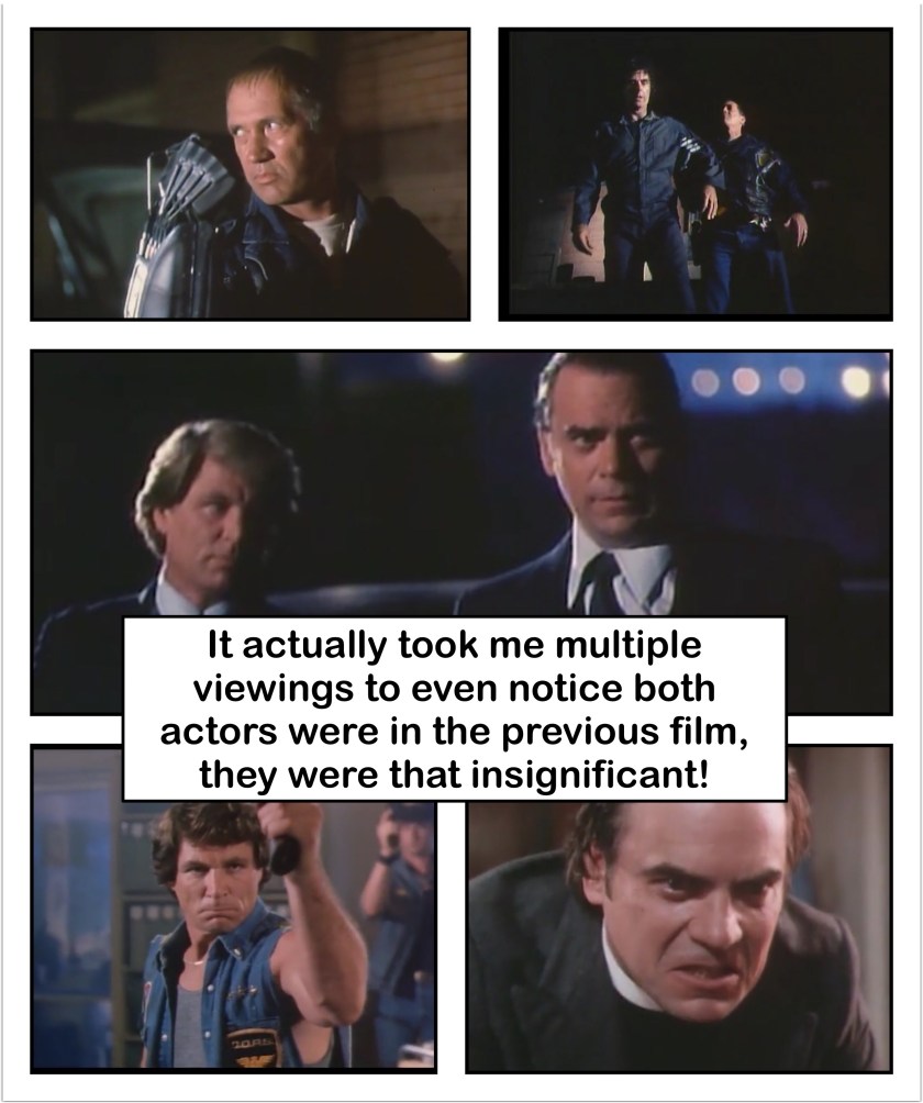 Hoffman’s goon (who’s name I believe is Dugan, but it doesn’t really matter, I’m just gonna call him Main Goon) disguises himself a fellow C.O.P.S. officer (most likely using his costume from the previous film), to break out the apprehended drug dealer (named Tony Ginetti, but I’m calling him Shazam, for reasons explained below), so that Hoffman can find out if he told Tucker anything about the shipment of drugs. Shazam assures him that he told Tucker nothing, so Hoffman plays some Russian roulette, pointing a six shooter at him with one bullet in the cylinder to help motivate him to tell the truth. Shazam repeats over and over that he told Tucker nothing (which as far as I know, he didn’t), and Hoffman finally says he believes him, but still kills Shazam (remember, bad guy!).