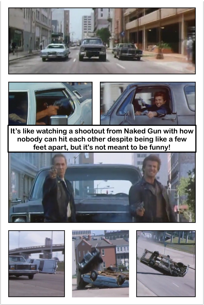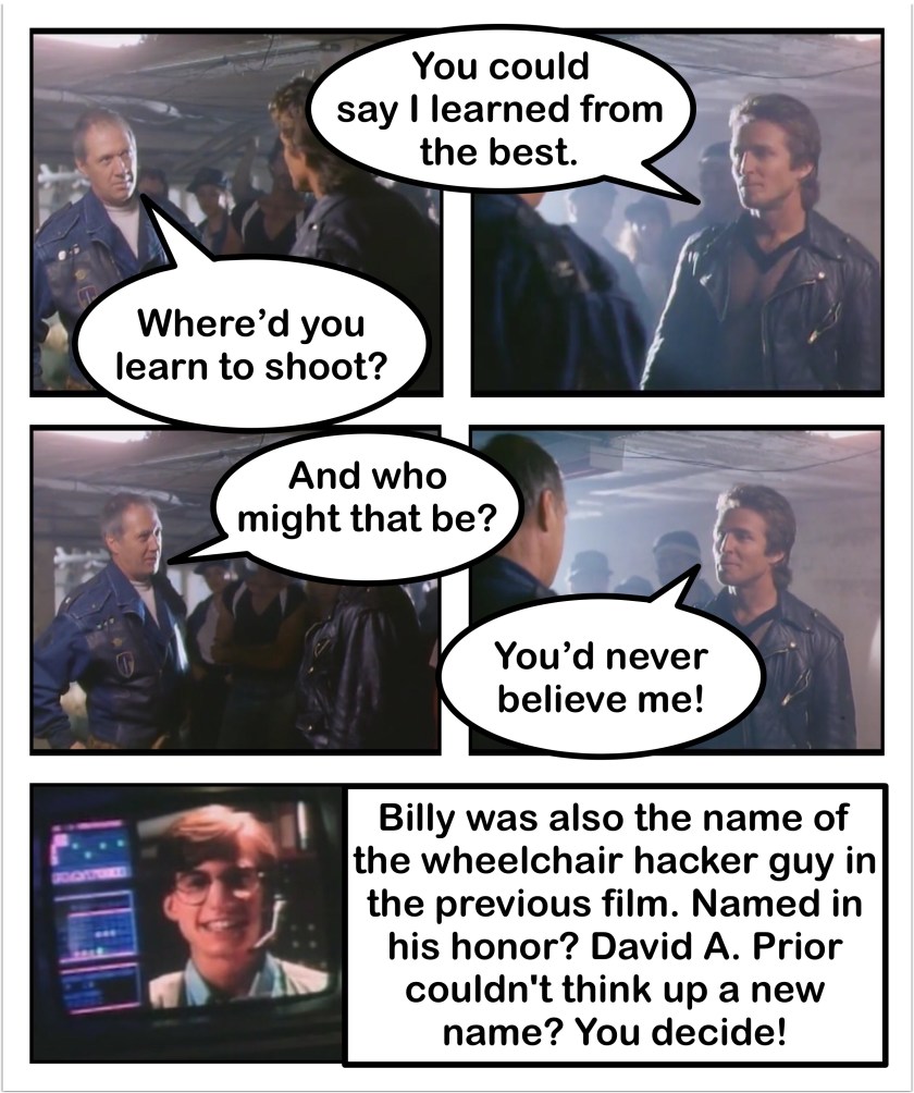 Tucker asks Billy how he knew where to find him, to which Billy just fumbles all over his words. Lucky for him, two of The dealers are in hot pursuit! A (kinda) fast chase ensues, with cars shooting at each other, nothing really getting accomplished (so on par with everything else in the film), besides Marion calling in to complain that Tucker ditched her. Eventually Tucker and Billy get out of the Tuckermobile and take care of the dealers thanks to a combination of shooting skill and lazy writing (mostly the latter). It also helps that for some insane reason it takes the dealers so long to actually get closer to them despite being in fucking cars!