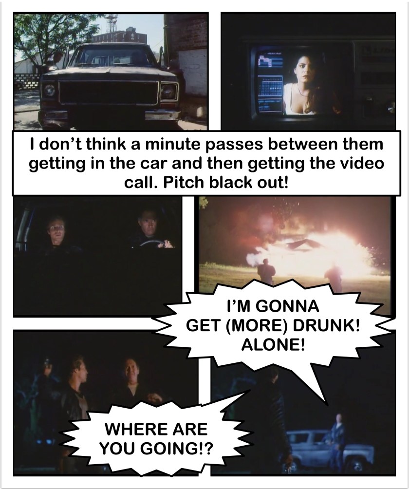 Hours later, Tucker and Billy are driving when they get a call on the future phone from Cindi. Apparently someone hacked her computers and that’s how that ambush was set up. He then thinks to actually go home and check on his wife, only for his house to blow up right in front of him and Billy (I’m sensing a theme here). Billy freaks out, because he saw the house in his time before he went back to Tucker’s time (and he STILL can’t figure it out!), but obviously Marion must be alive seeing as Billy still exists. Instead of Tucker going to look to see if Marion is alive, he announces that he’s going to get drunk alone (which implies that he’s been sober at all this whole time, which I call bullshit on!).