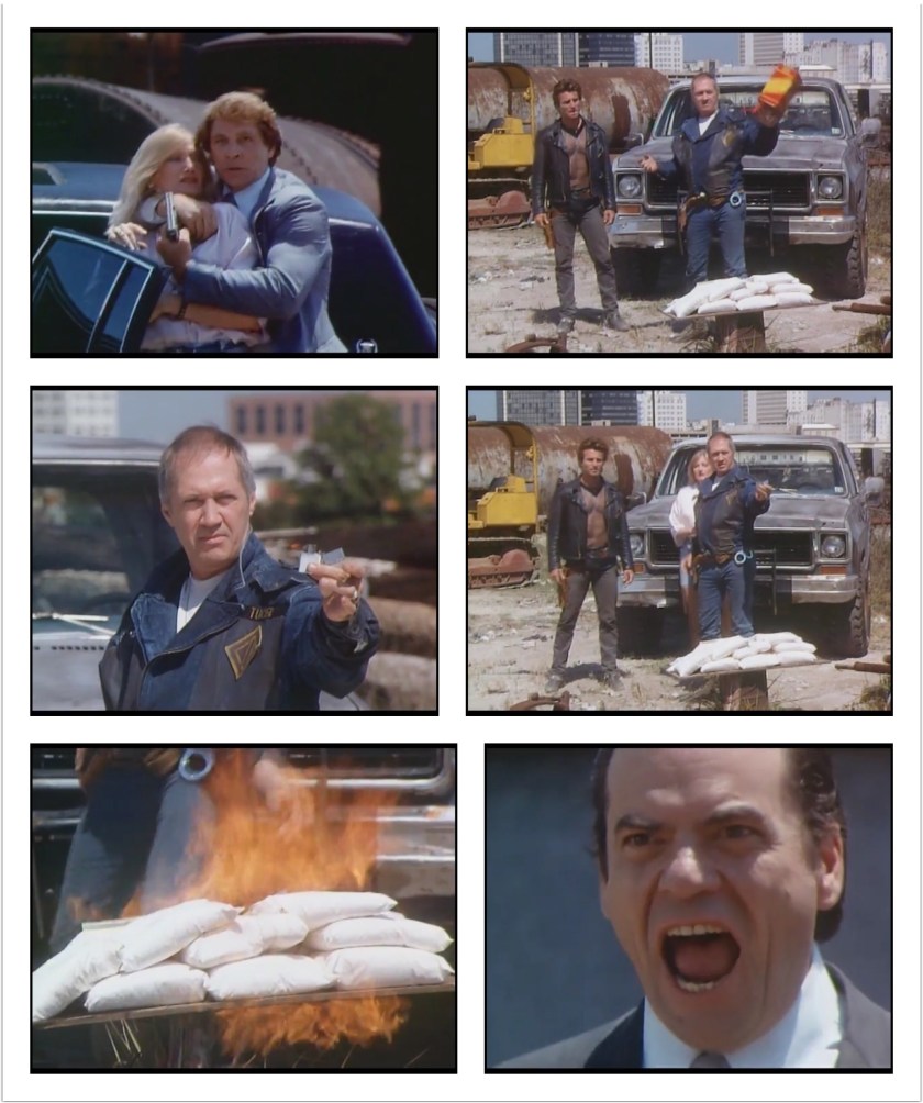After a bit of back and forth with Hoffman, they threaten to set the drugs on fire if he don’t hand Marion over (never mind that Hoffman has a few snipers set up in the area, with nothing hampering their shot!), he hands her over and OF COURSE Tucker lights the drugs on fire, leading to a so-so gun fight. What’s more impressive is how Tucker and Billy have better aim than the fucking snipers! Maybe that’s why he doesn’t need to use the glove often! No wait it’s because the movie is cheap!
