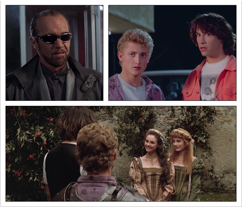 Problem is, they’re not doing so great in school, especially history class. If they fail to get an A+ on an upcoming oral report, their teacher (Casey) will have no choice but to fail them, which is totally heinous. Most heinous still, if Ted flunks school, his police chief father (Landon) will send him to a military school in Alaska, meaning they won’t be able to keep the band going. It also means no utopian future! Bogus!