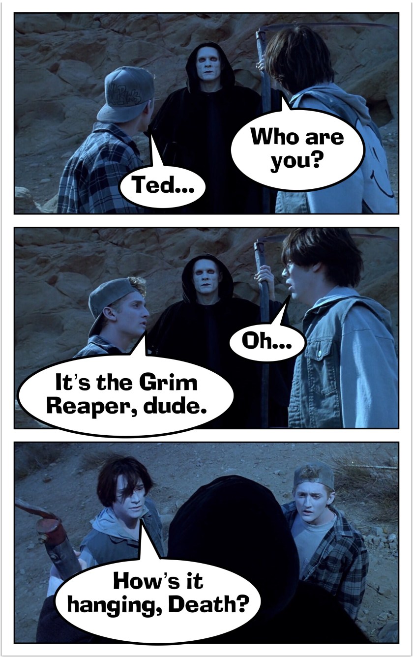 The two hero dudes are greeted by the Grim Reaper (Sadler), who says they can regain their lives if they can beat him at a contest, but losing will mean they remain in the afterlife forever, and he has never lost. Not so confident in their ability to win (and wanting to keep their fiancées safe), they “Melvin” Death and head back to San Dimas. [For those unfamiliar (which included myself at first), a Melvin is a variation on the wedgie, were instead of pulling someone’s underwear from the back, you pull from the front.] They witness their evil robot selves making a total mess of their lives, including their relationship with the princess babe fiancés! Robotic dickweeds! So now they try to find help.