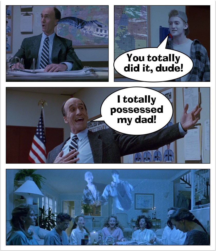 They first attempt to posses Ted’s police captain dad (Landon) and his deputy (Brocksmith), to get help, but are met with confusion by their fellow officer dudes. This proves most ineffective! So they then see Missy (Stock-Poynton; who was once Bill’s stepmom, but now she’s Ted’s stepmom!) holding a seance with some buddies. They try to communicate with them, but Missy thinks they’re evil spirits, and uses a chant to have them banished to Hell! Most heinous!