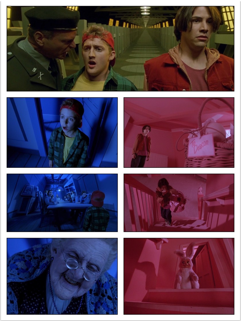 In Hell, our totally awesome heroes encounter the Dark Lord himself, and are then forced to encounter some of their most heinous fears! This includes an encounter with Colonel Oates (Ross) the dude in charge of the military school in Alaska that Captain Logan wanted to send his son to. Splitting up, they encounter different fears from the past. Young Ted sees a horrific Easter Bunny chastising him for stealing candy from his little brother, while Young Bill goes to the birthday party of Granny S. Preston, Esq. (also Winter in heavy old lady makeup) who wants a kiss!