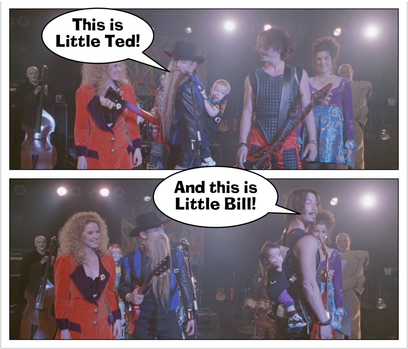 Ms. Wardroe turns out to be Rufus all along! Woah! After all, who else would’ve let them play in the show? Bill and Ted do a little traveling through time with the Princess Babes to get better at guitar, plus have a honeymoon, and they even become parents! Excellent! They give a totally awesome speech and then totally rock out!
