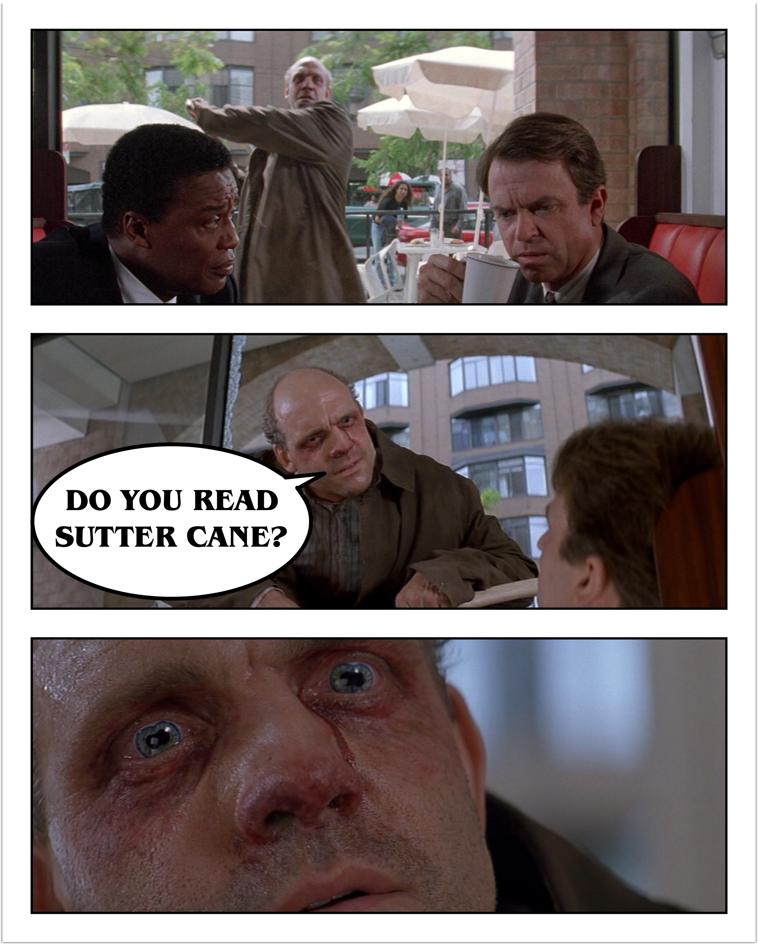 Freelance insurance investigator, John Trent (Neill), is tasked by Arcane Publishing director, Jackson Harglow (Heston), to look into the disappearance of their most profitable client, horror author Sutter Cane (Prochnow). Cane’s disappearance occurred around the release of his latest book, seemingly causing people go insane and even turn homicidal. Trent himself was almost attacked by an ax wielding maniac (later revealed to be Cane’s agent), who asks Trent “Do you read Sutter Cane?” before the police shoot him dead.