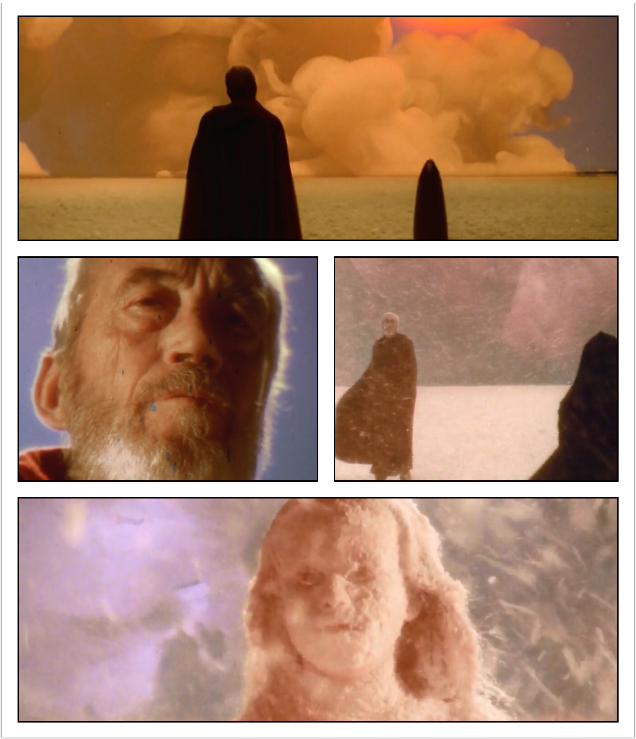 We open on an old guy in robe (Academy Award winning filmmaker John Huston!), standing in some trippy looking landscape. He then sees a vision of a storm and a little girl covered in what I think was supposed to be snow/ice. [This was 1979, so it could’ve also been cocaine!] Said man is Jerzy Colsowicz, who’s some kind of intergalactic space warrior. We then cut to some sort of space Jesus (Italian cult icon Franco Nero; the film doesn’t flat out say who his character is, but it’s pretty obvious!) in what appears to be a white terrarium to a bunch of bald children in gold robes. He’s telling them a story.
