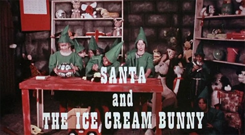 The elves at the North Pole sing an awful song (the first of many in this movie!) wondering where the hell Santa Claus is, as Christmas is just around the corner. Then a drunk sounding narrator chimes in explaining that Santa and the reindeer where flying around for some reason, when the sled crashed on a beach in Florida. The reindeer left Santa’s fat ass behind because of the heat, and now he’s just baking in the sun complaining about his predicament.