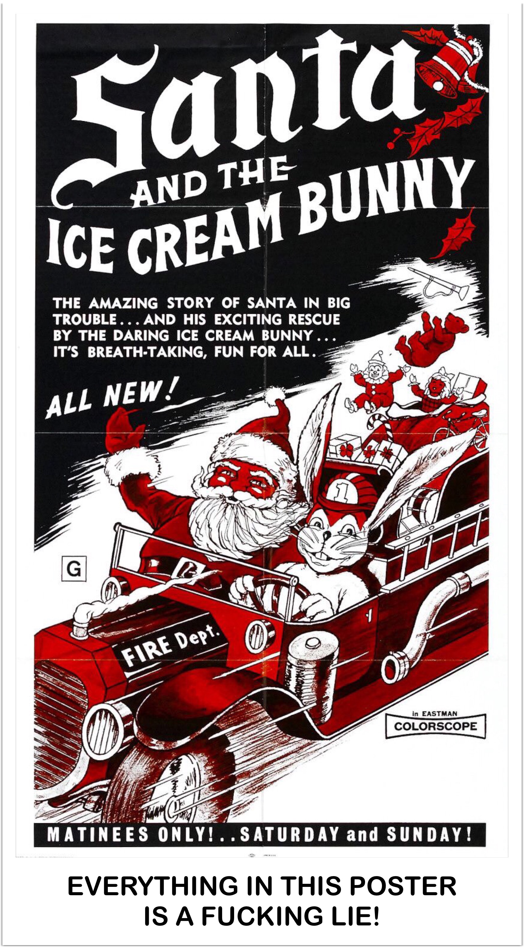 And this is where the movie cuts to a completely different movie, which (depending on what cut you’re watching), features a bastardized adaptation of Thumbelina or Jack and the Beanstalk. Neither connects to the main story in any way! The guy dubbing Santa isn’t even narrating either story. In fact, Jack and the Beanstalk has no narration, so in that way it’s has a “better flow” to it. Because of how Thumbelina was edited in, it leads to even more what the fuck situations. I shall explain in my descriptions of each version, starting with… [I don’t want this review to be as crazy long as it is already, so the reviews involving the two fairy tales will be separated into different entries.]