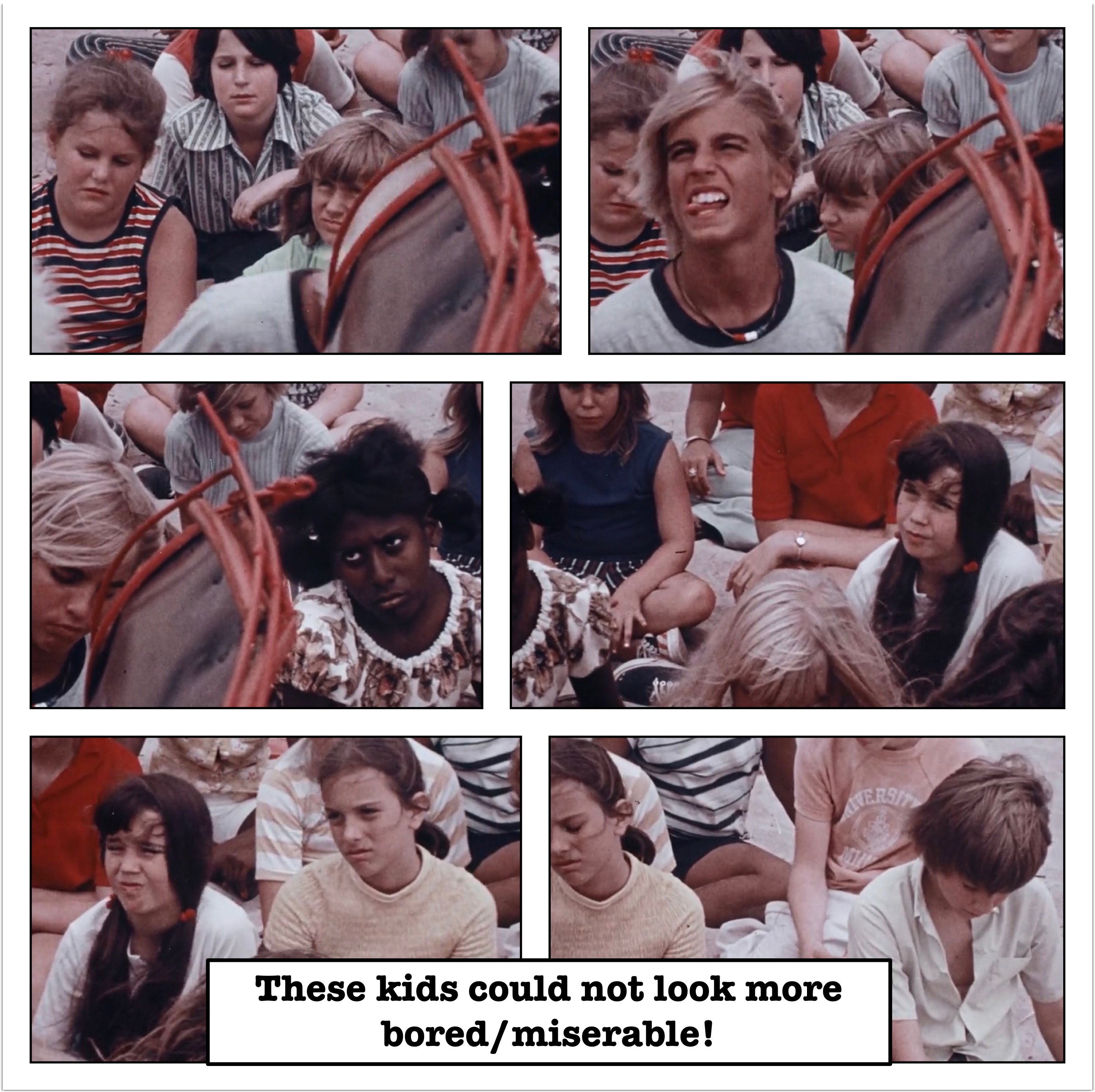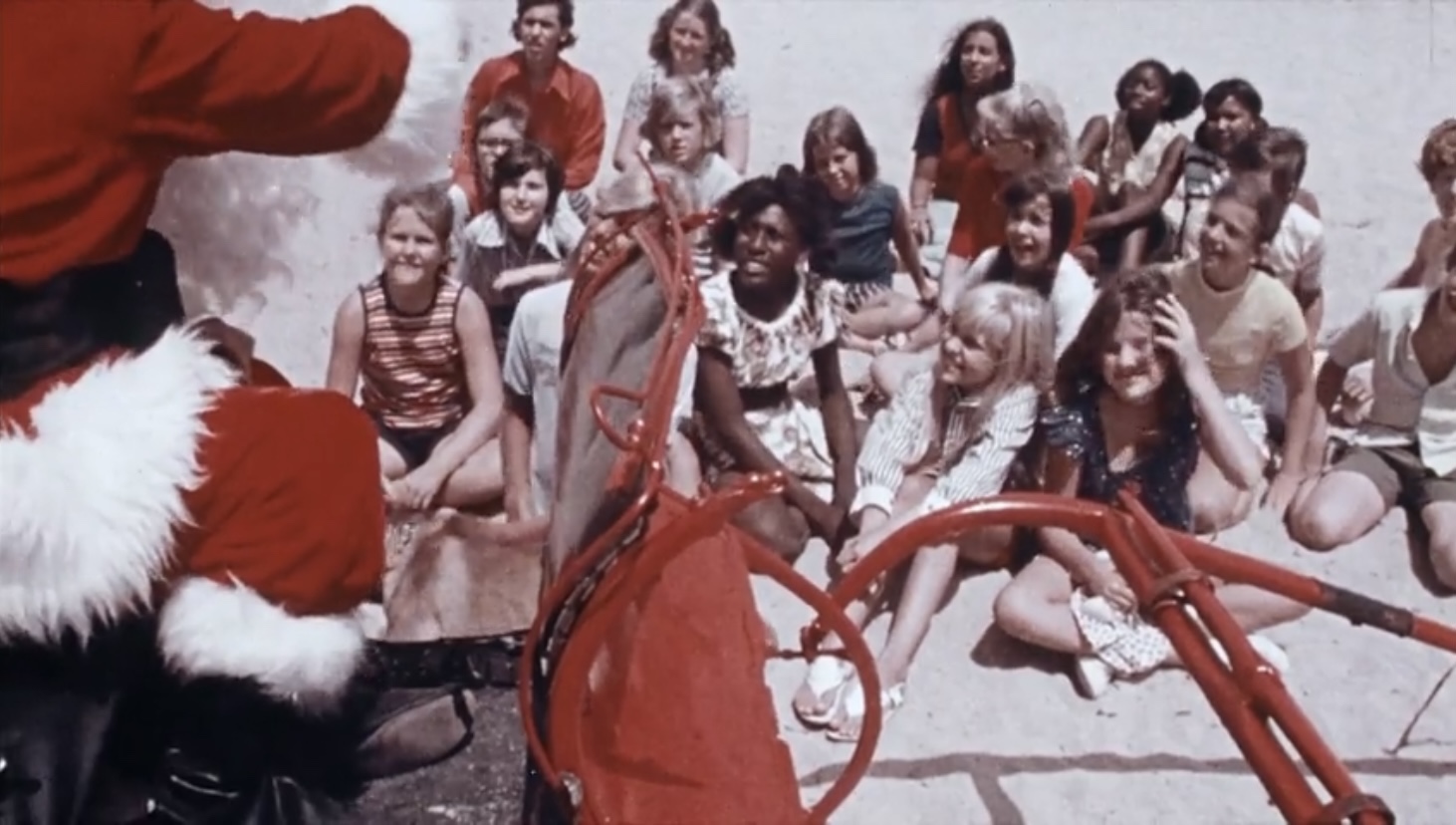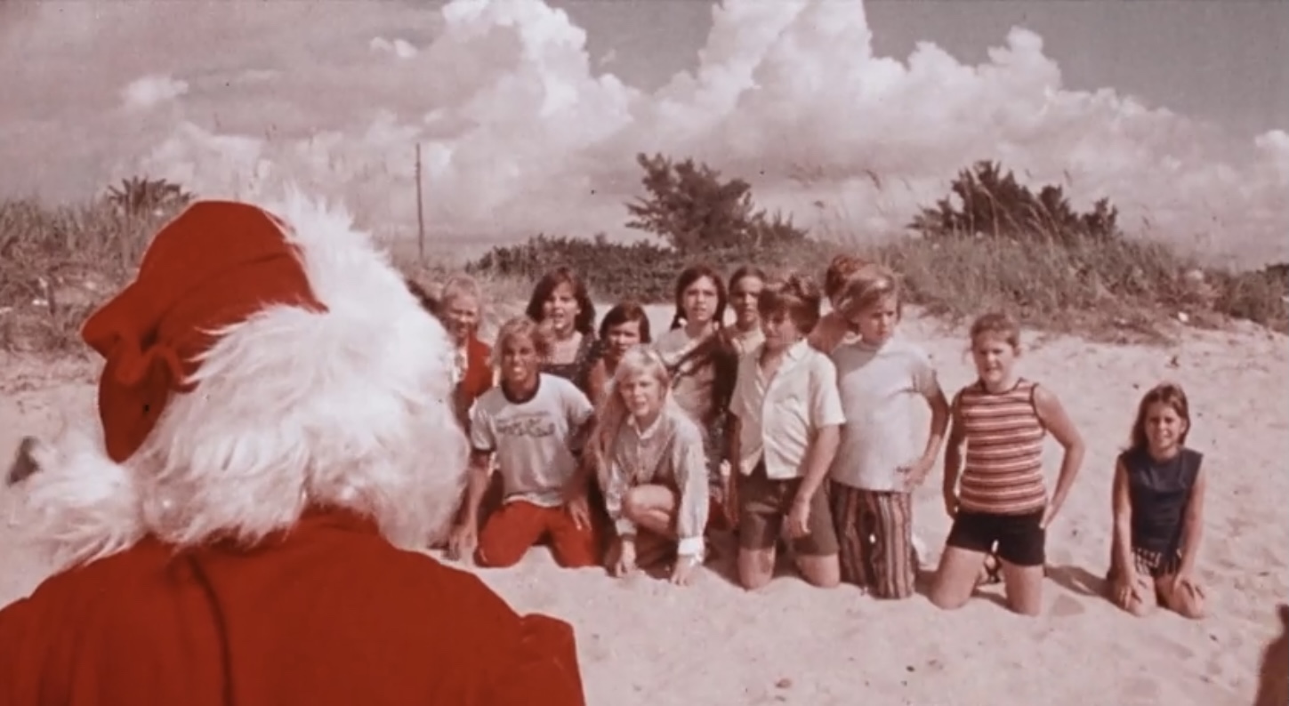 Once Jolly Ol’ St. Shithead is done warbling out this oh so amazing tune, he collapses back onto the seat of the sleigh and appears to pass out (as evident by his overdubbed snoring). He then seems to telepathically call out to all the random children who were frozen in time earlier (saying some by name, then just girls, and kids), and they all go rushing towards his location. How far some of them are from said beach I have no idea (or care), but it seems in the 70s parents weren’t as concerned about their kids running off to random places on their own. A much simpler, stupider time, folks!
