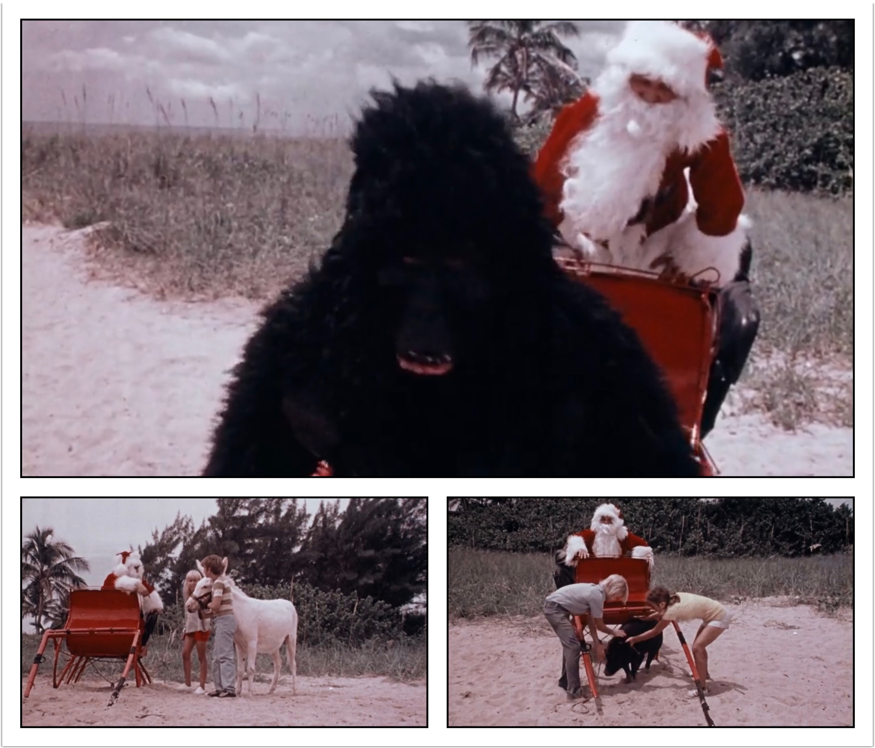 One thing is for sure, these animals are not happy to be here! I can’t blame them! I feel the most sorry for them, even more so than than the undoubtably miserable kids forced into this! They at least have some idea of what the fuck is going on! The animals meanwhile are just wondering why they’re being pulled around on a hot ass beach, being pushed around by random kids! I’m shocked none of them went crazy and started trampling some folk! Also, when Santa attempts to push an animal you can see the bottom of his pants, and I’m almost positive that he shit his britches! I’m not trying to be funny here (well, maybe a little), there’s some kind of dark stain there on his ass! I know I’m not the only one thinking it!