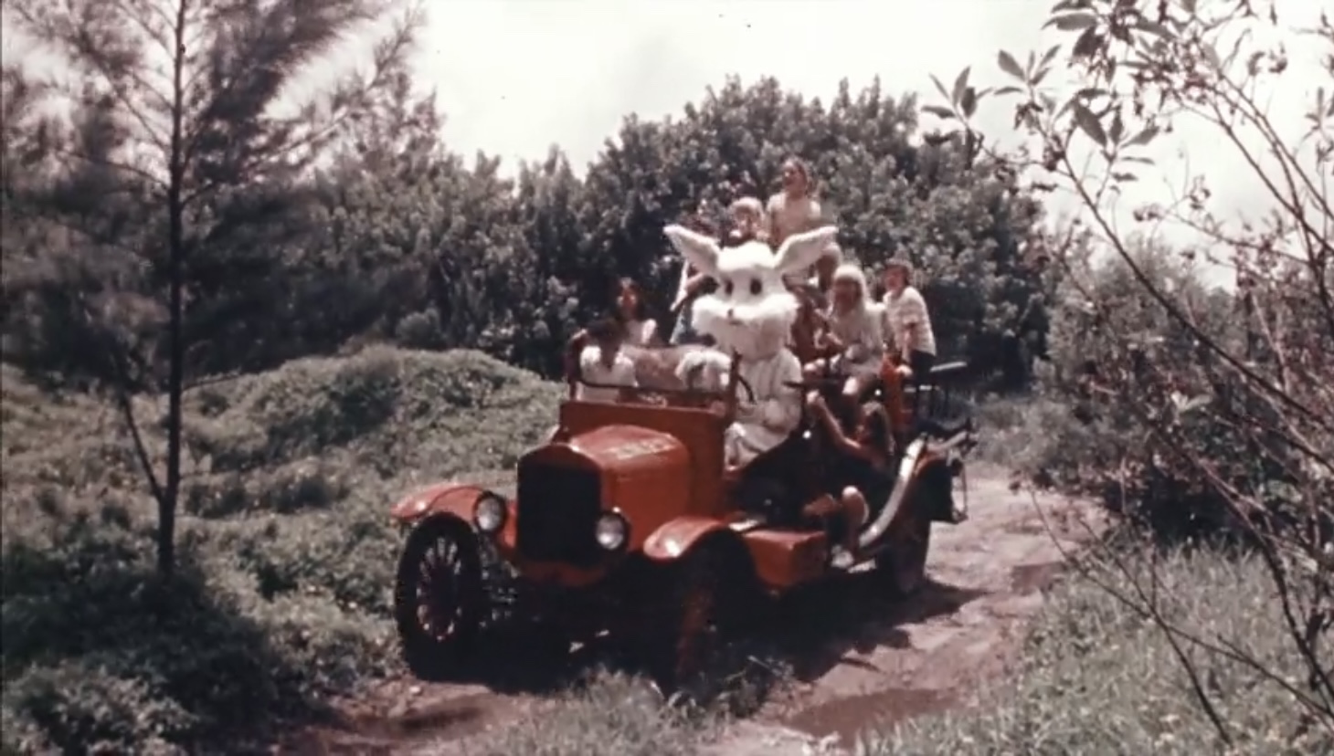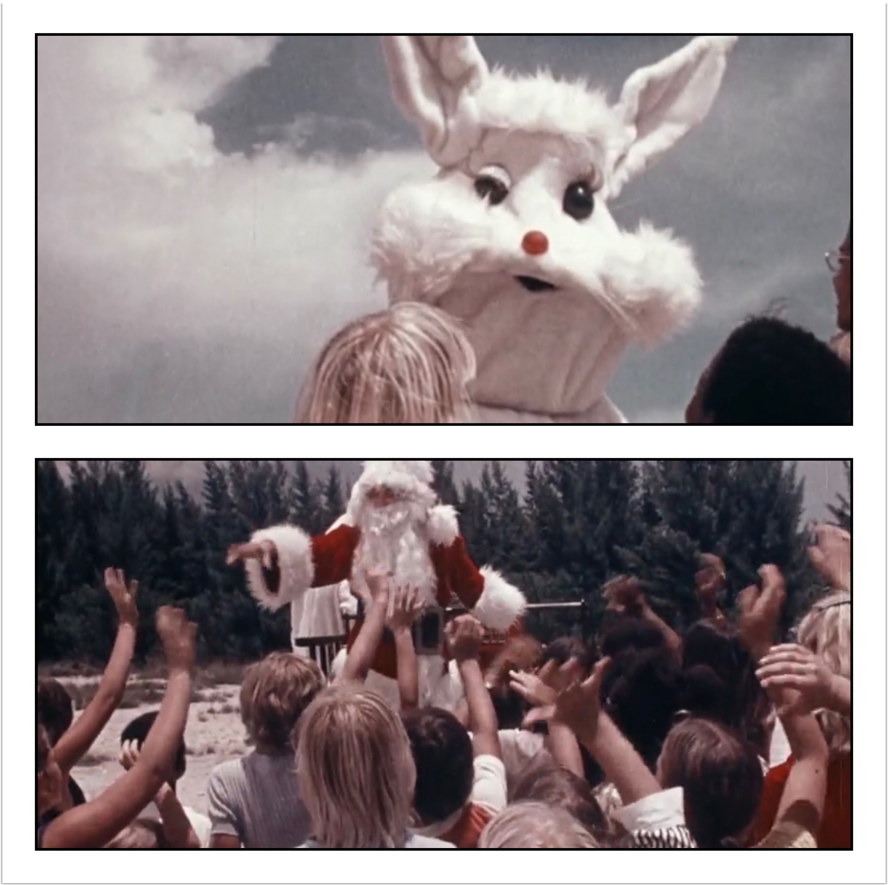 The narrator and Santa act like it’s obvious who this fucking bunny is, but I doubt any of the kids appearing in this were familiar with this cracked out looking hare! Nothing about him says ice cream, if anything he looks like a creepy ass Easter Bunny you see at a mall. A bunny that’s taken tons of meth (they are in Florida). More evidence that the guy in the costume can’t see is how he clearly feels around for something, mostly grabbing air. Santa drives off with the Ice Cream Bunny (I’m pretty sure you can’t drive to the North Pole, but if we’re lucky they’ll drown along the way). We get another shot of Tom Sawyer and Huckleberry Finn looking on. As if they had anything to do with anything going on (although they have more screen time than the supposed secondary character)!