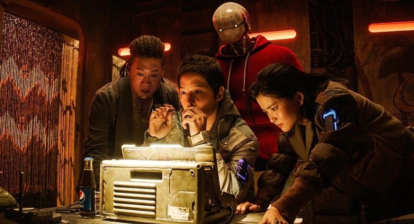 Many non-citizens, from all across the globe, work as space sweepers, collecting the space debris floating in Earth’s orbit and selling it to the company for survival. This includes the crew of The Victory: Jang (Kim), the alcoholic captain who’s really good with guns; Tiger Park (Jin), the ship’s gruff mechanic; Bubs (Yoo), a former military android who handles collecting the debris (as he can stand outside the ship without a suit); and Tae-ho (Dom), the aloof pilot.