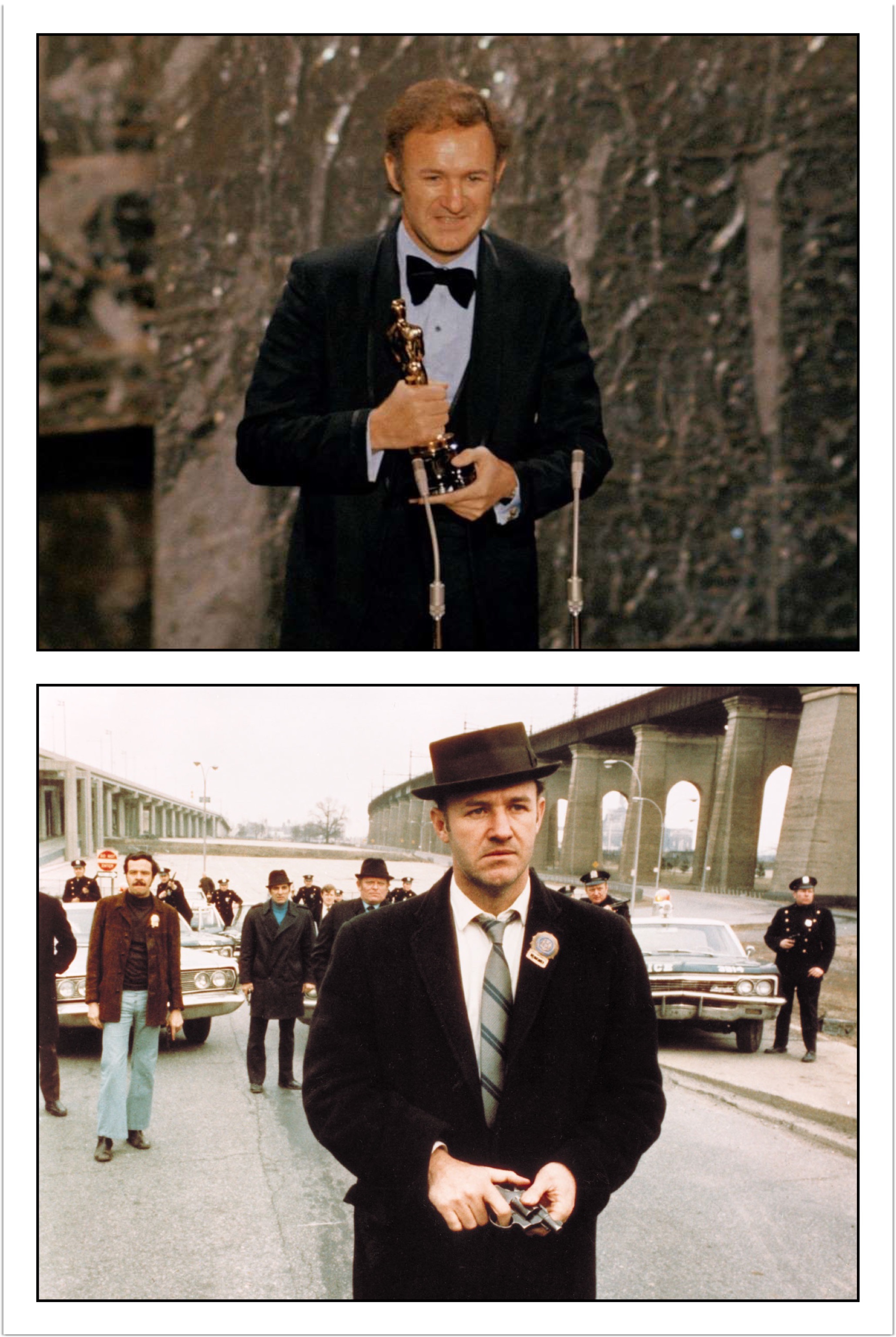 Other films in the early 1970s include Doctors’ Wives (1971), with Dyan Cannon, O’Connor, Richard Crenna, Janice Rule, John Colicos, and Rachel Roberts; The Hunting Party (1971), with Oliver Reed, Candice Bergen, Simon Oakland and Ronald Howard; he won his first Academy Award (Best Actor) for William Friedkin’s The French Connection (1971), with The French Connection (1971), with Fernando Rey, Roy Scheider, Tony Lo Bianco, and Marcel Bozzuffi; Prime Cut (1972), with Lee Marvin and Sissy Spacek; Ronald Neame‘s The Poseidon Adventure (1972), with Ernest Borgnine, Jack Albertson, Shelley Winters, Red Buttons, and Leslie Nielsen; Scarecrow (1973), with Al Pacino and Eileen Brennan; Francis Ford Coppola‘s The Conversation (1974), with John Cazale, Allen Garfield, Cindy Williams, Frederic Forrest, Harrison Ford, Teri Garr, and Robert Duvall; a small role in Mel Brooks‘ Young Frankenstein (1974), with Gene Wilder, Peter Boyle (the only actor he shared a scene with) Garr, Cloris Leachman, Marty Feldman, Madeline Kahn, and Kenneth Mars; and Zandy’s Bride (1974), with Liv Ullman.