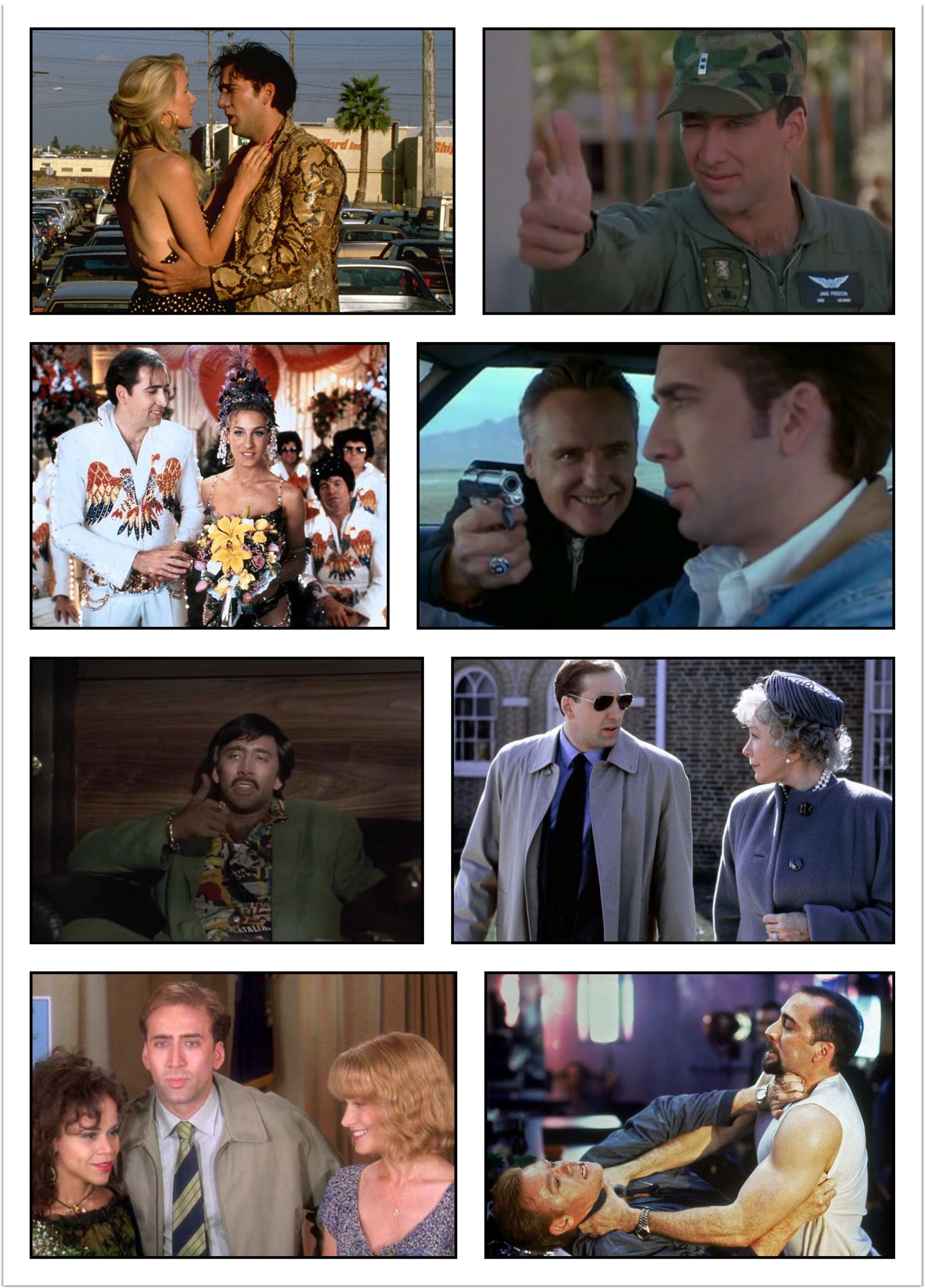 In the early 90’s, Cage starred in such films as David Lynch‘s Wild at Heart (1990), with Laura Dern, Diane Ladd, Willem Dafoe, Harry Dean Stanton, and Isabella Rossellini; David Green’s Fire Birds (1990), with Tommy Lee Jones and Sean Young; Andrew Bergman’s Honeymoon in Vegas (1992), with James Caan, Sarah Jessica Parker, Pat Morita, and Anne Bancroft; John Dahl’s Red Rock West (1993), with Lara Flynn Boyle, J.T. Walsh, Hopper, and Dwight Yoakam; Christopher Coppola’s Deadfall (1993), with Michael Biehn, James Coburn, and Charlie Sheen; Hugh Wilson’s Guarding Tess (1994), with Shirley MacLaine and Austin Pendleton; Bergman’s It Could Happen to You (1994), with Bridget Fonda and Rosie Perez; and Barbet Schroeder’s Kiss of Death (1995), with David Caruso and Samuel L. Jackson.