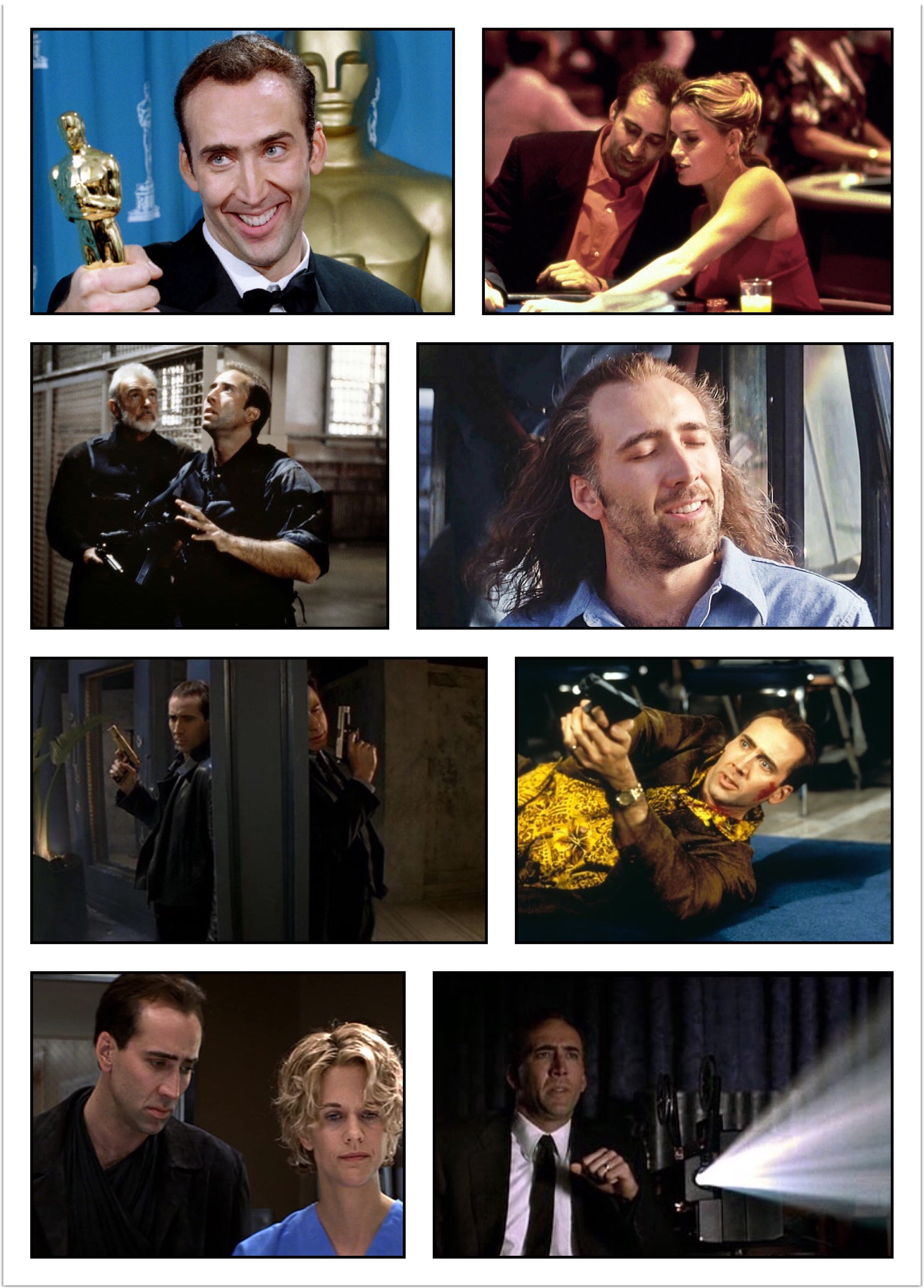Cage received an Academy Award, a Golden Globe, and Screen Actors Guild Award for his performance as an alcoholic Hollywood writer in Mike Figgis’s Leaving Las Vegas (1995) with Elizabeth Shue, before coming to the attention of wider audiences with mainstream films, such as The Rock (1996), with Sean Connery and Ed Harris; Simon West’s Con Air (1997), with John Cusack, John Malkovich, and Steve Buscemi; John Woo‘s Face/Off (1997), with John Travolta; Brian De Palma‘s Snake Eyes (1998), with Gary Sinise and Carla Gugino; Brad Silberling’s City of Angels (1998), with Meg Ryan; and Joel Schumacher‘s 8mm (1999), with Joaquin Phoenix, James Gandolfini, Peter Stormare, and Anthony Heald.
