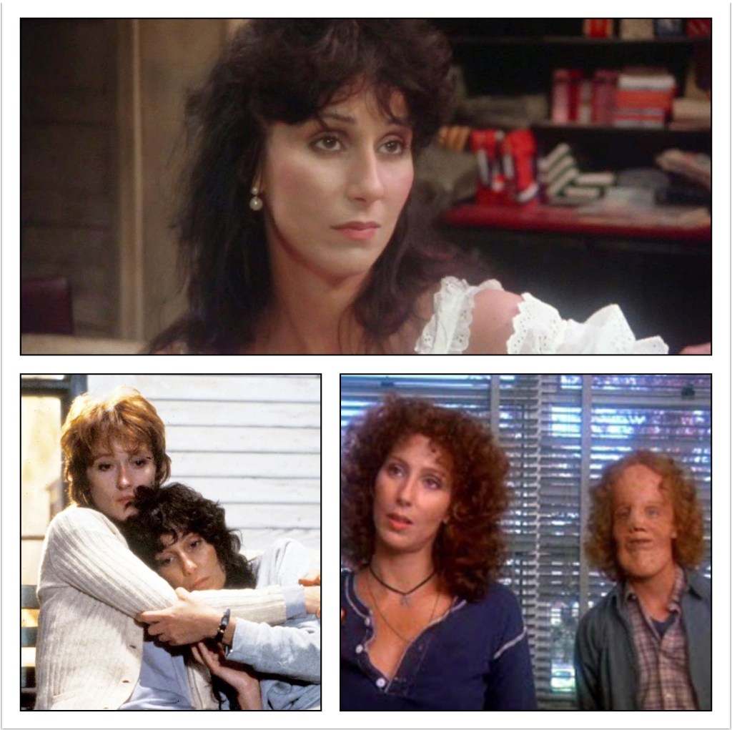 Cher then appeared in Robert Altman’s Come Back to the Five and Dime, Jimmy Dean, Jimmy Dean (1982), with Sandy Dennis, Mark Patton, Karen Black, Sudie Bond, and Kathy Bates; based on the play that she had previously made her Broadway debut in. She won a Golden Globe for Best Supporting Actress and received a nomination for the Academy Award for Best Supporting actress for Mike Nichols’s Silkwood (1983), with Meryl Streep and Kurt Russell. She then received a nomination for the Golden Globe for Best Actress – Drama for Peter Bogdanovich’s Mask (1985), with Sam Elliott, Eric Stoltz, Dennis Burkley, Laura Dern, Estelle Getty, and Richard Dysart.
