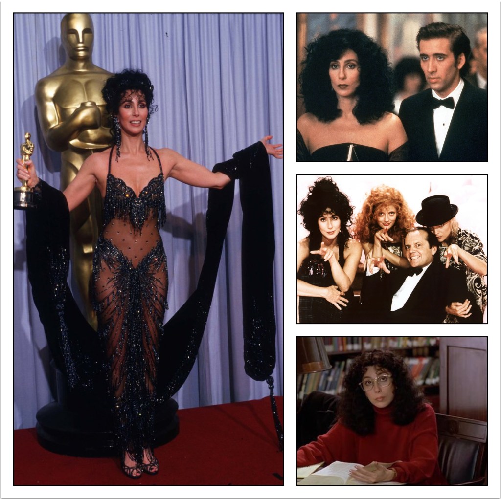 Her nexts films were George Miller’s The Witches of Eastwick (1987), with Jack Nicholson, Susan Sarandon, Michelle Pfeiffer, Veronica Cartwright, and Richard Jenkins; Peter Yates’s Suspect (1987), with Dennis Quaid, Liam Neeson, John Mahoney, Joe Mantegna, Fred Melamed, and Philip Bosco; and Norman Jewison’s Moonstruck (1987), with Nicolas Cage, Danny Aiello, Olympia Dukakis, and Vincent Gardenia; the latter she won the Academy Award for Best Actress.