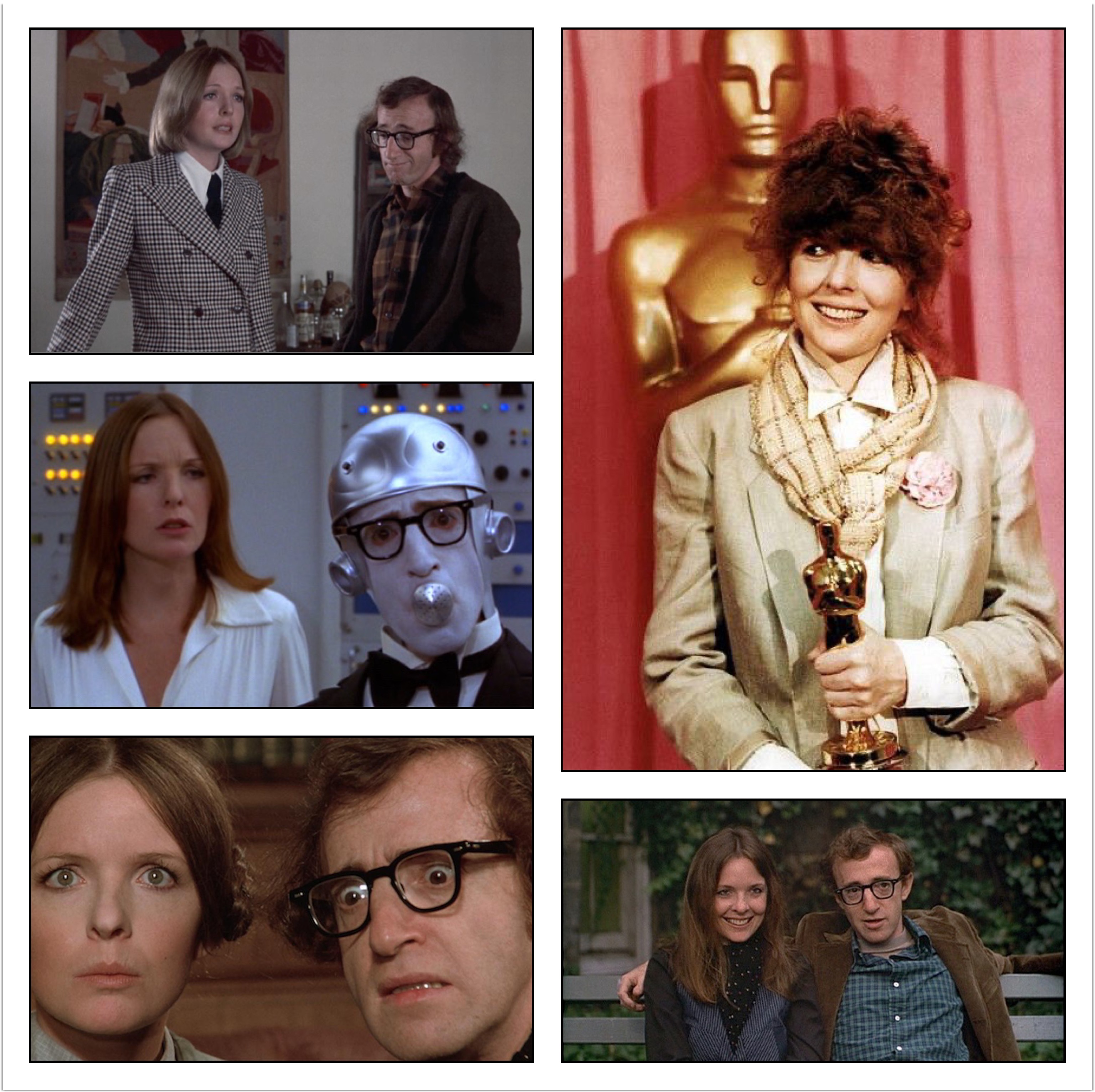 The films that most shaped her career were those with director and co-star Woody Allen, beginning with Herbert Ross‘s Play It Again, Sam (1972). Her next two films with Allen, the futurist science fiction comedy Sleeper (1973) and the period piece Love and Death (1975), established her as a comic actor. Her fourth, the romantic comedy Annie Hall (1977), with Tony Roberts and Christopher Walken; won her the Academy Award for Best Actress. To avoid being typecast as her Annie Hall persona, Keaton became an accomplished dramatic performer, starring in Richard Brook‘s Looking for Mr. Goodbar (1977), with Tuesday Weld, William Atherton, Richard Kiley, and Richard Gere; and Interiors (1978), with Kristin Griffith, Mary Beth Hurt, Richard Jordan, E.G. Marshall, Geraldine Page, Maureen Stapleton, and Sam Waterston.