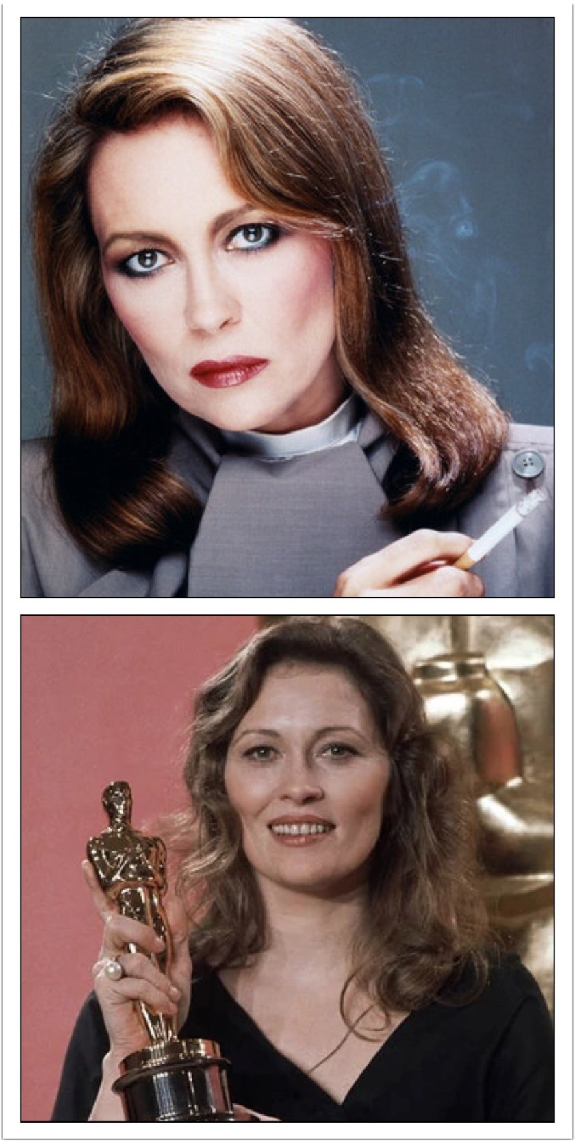 Her Notable roles in the 1970s include Penn’s Little Big Man (1970), Dustin Hoffman, Chief Dan George, Martin Balsam, Jeff Corey and Richard Mulligan; Stanley Kramer‘s Oklahoma Crude (1973), with George C. Scott, John Mills and Jack Palance; Richard Lester‘s The Three Musketeers (1973), with Oliver Reed, Charlton Heston, Raquel Welch, Richard Chamberlain, Frank Finley, Michael York, and Christopher Lee; Roman Polanski’s Chinatown (1974), with Jack Nicholson, John Hillerman, Perry Lopez, Burt Young, and John Huston; for which she earned her second Oscar nomination; John Guillerman’s The Towering Inferno (1974), with McQueen, Paul Newman, William Holden, Fred Astaire, Susan Blakely, Richard Chamberlain, O.J. Simpson, Robert Vaughn, Robert Wagner, Susan Flannery, Gregory Sierra, Dabney Coleman, and Jennifer Jones; Sydney Pollack’s Three Days of the Condor (1975), with Robert Redford, Cliff Robertson, and Max von Sydow; Sidney Lumet’s Network (1976), with Holden, Peter Finch and Robert Duvall; for which she won an Academy Award for Best Actress; and Irvin Kershner‘s Eyes of Laura Mars (1978), with Tommy Lee Jones, Brad Douriff, René Auberjonois, and Raul Julia.