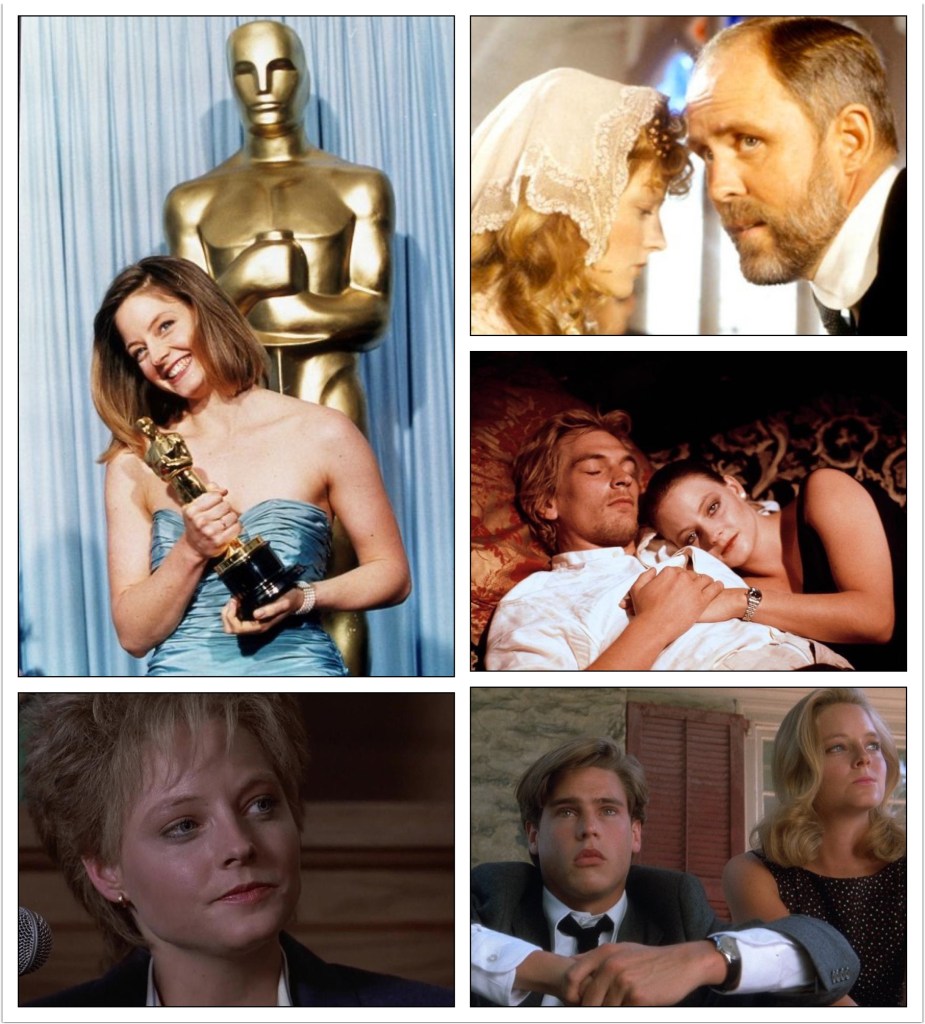 Foster won her first Academy Award for Best Actress for Jonathan Kaplan’s The Accused (1988), with Kelly McGillis, Bernie Coulson, Leo Rossi, Ann Hearn, Carmen Argenziano, Steve Antin and Tom O’Brie. Other films in the late 1980s include Mesmerized (1986), with John Lithgow and Michael Murphy; Siesta (1987), with Ellen Barkin, Gabriel Byrne, Julian Sands, Isabella Rossellini, Sheen, Alexi Sayles, and Graces Jones; and Stealing Home (1988), with Mark Harmon, Blair Brown, Jonathan Silverman, Harold Ramis, William McNamara, John Shea, Helen Hunt, and Richard Jenkins.